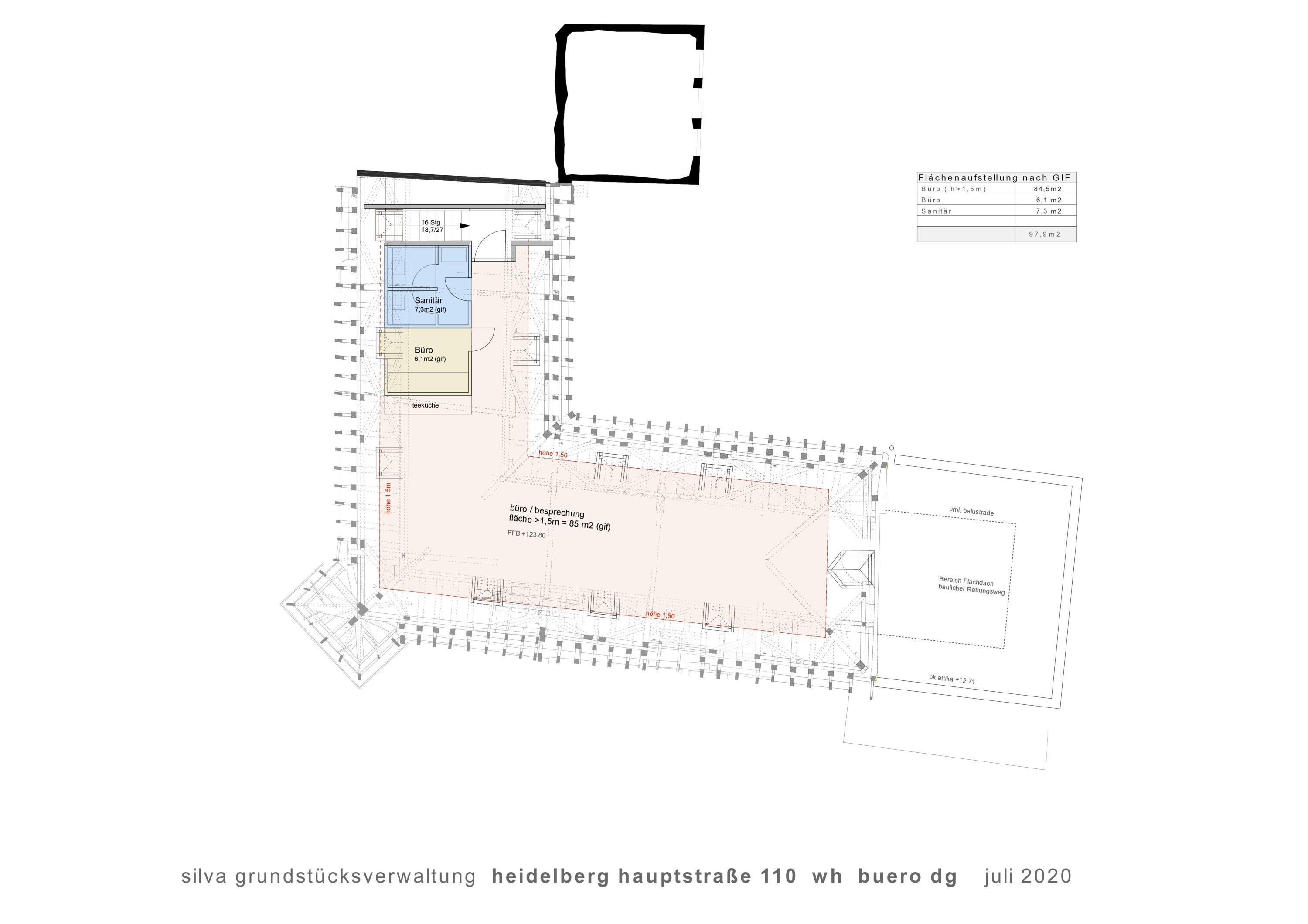 Im ersten Obergeschoss stehen großzügige 209 m² zur Verfügung, während das dritte Obergeschoss eine Fläche von 98 m² bietet. Beide Etagen wurden mit viel Sorgfalt renoviert und bieten eine Arbeitsatmosphäre, die den historischen Charme des Gebäudes mit den Annehmlichkeiten moderner Büroeinrichtungen kombiniert.