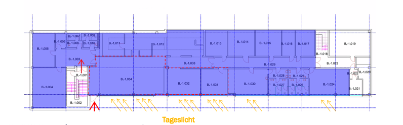 Besonderes Highlight ist die flexible Flächenaufteilung, die individuelle Nutzungskonzepte erlaubt. Beispielhaft bietet eine Einheit im Souterrain ca. 650 m² Lagerfläche in Kombination mit ca. 153 m² Bürofläche. Moderne Ausstattungselemente wie abgehängte Decken mit integrierter Beleuchtung, eine Raumhöhe von etwa 2,70 m sowie außenliegender Sonnenschutz sorgen für angenehme Arbeitsbedingungen.