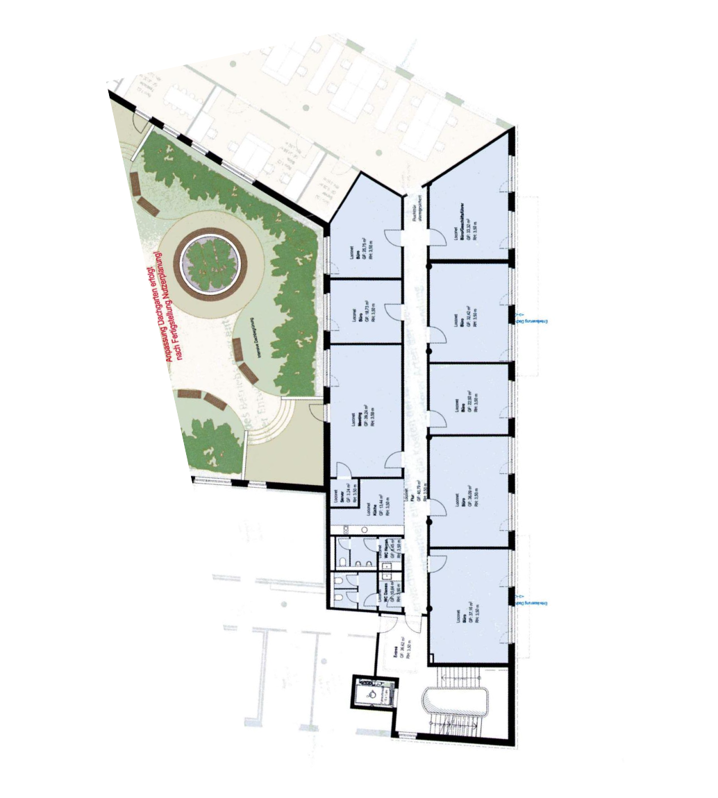 Das moderne Bürogebäude in der Stahnsdorfer Straße in Potsdam bietet eine hochwertige Ausstattung und optimale Voraussetzungen für einen komfortablen und effizienten Arbeitsalltag. Große Fensterflächen mit Sonnenschutzverglasung oder außenliegendem Sonnenschutz an der Süd- und Südost-Fassade sorgen für angenehmes Tageslicht und ein angenehmes Raumklima.