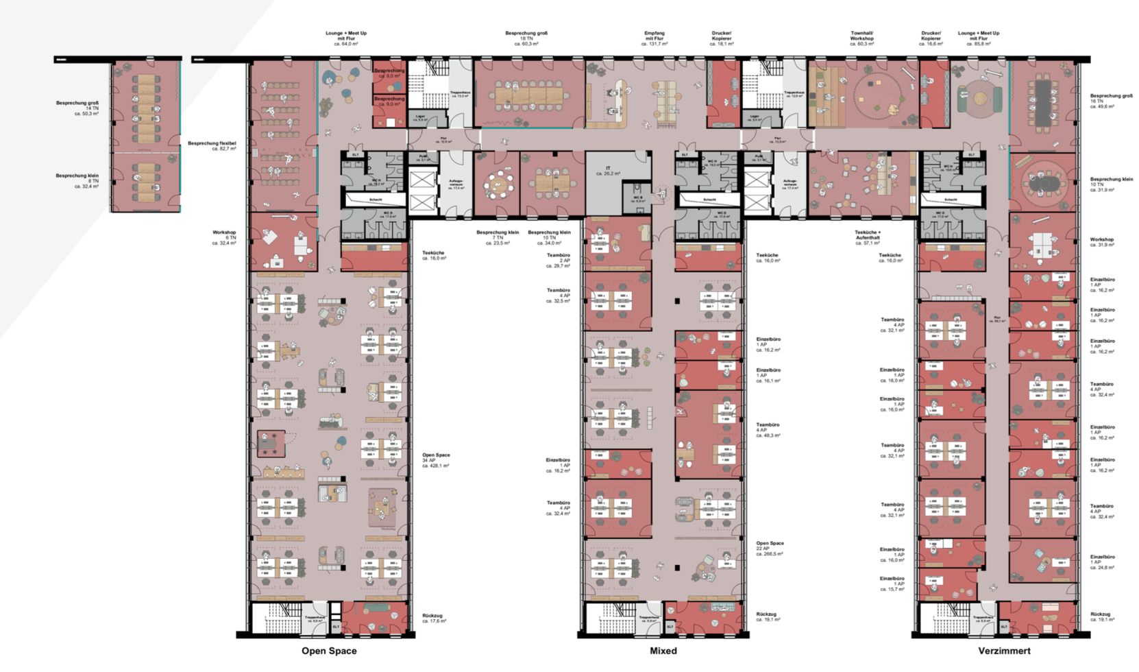 Die großzügigen Innenhöfe und ein überdachter Raucherbereich schaffen zusätzliche Aufenthaltsmöglichkeiten. Überdachte Fahrradstellplätze sowie ein zweigeschossiges Parkdeck mit 351 Pkw-Stellplätzen und 6 E-Ladestationen (erweiterbar bei Bedarf) gewährleisten beste Erreichbarkeit. Zwei Zufahrten mit Schranken- und Ampelsystem erleichtern die An- und Abfahrt.